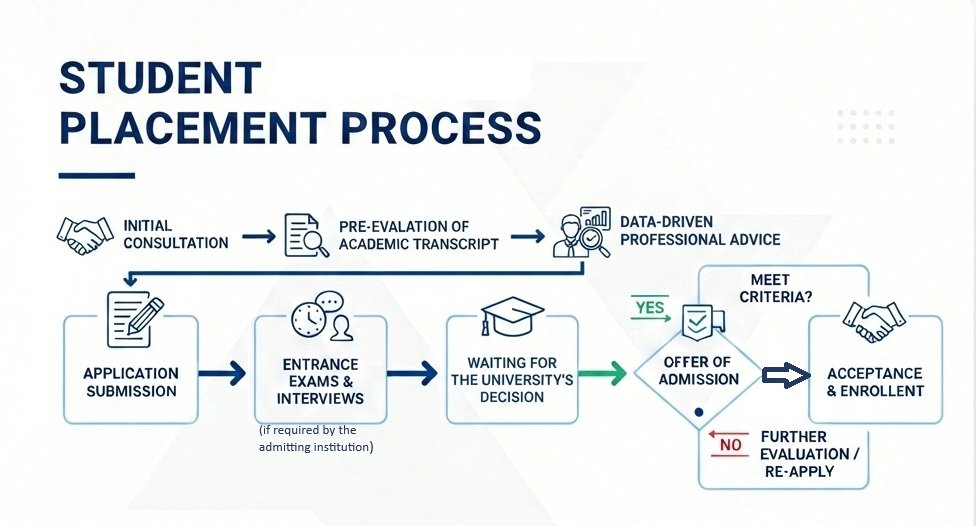 Our Placement Process is a structured, data-driven pathway that guides applicants from initial transcript review through final enrollment. By combining academic profiling, strategic program matching, and institutional coordination, we ensure that each application is positioned for the highest probability of admission while maintaining full transparency at every stage.